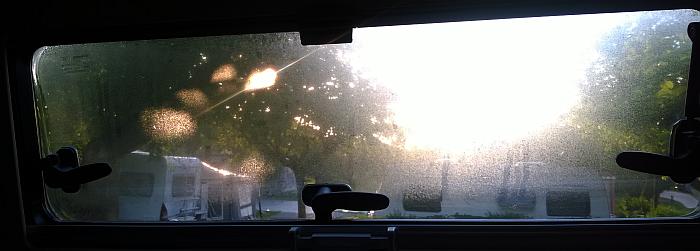 7 Uhr! Entwarnung! Die Sonne schickt ihre ersten Strahlen durch den Morgentau am Fenster!
