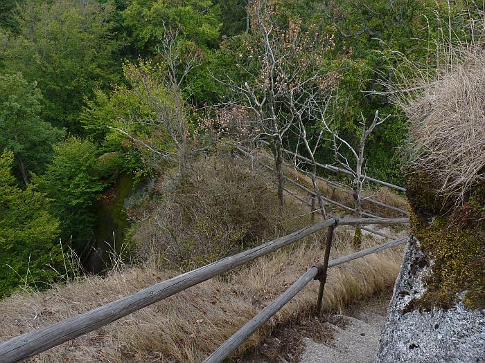Weissenstadt - Wanderung Es hat aufgehört zu regnen - doch die Sonne lässt sich nicht blicken. ![]() Also wo soll es hingehen? ![]() Wenn schon eine "schwarze" Strecke - die schwarze 8 - passt auch. ![]() Auf Waldwegen - mit vielen "Wurzelhindernissen" geht es bergauf - ins Gebirge. ![]() Ein Blick zurück - der See ist schon weit entfernt - dito die Sonne! ![]() Aus romantischen Graswegen werden ... ![]() ... schweißtreibene Anstiege! ![]() OK - wir sind ja auch auf dem fränkischen Gebirgsweg. ![]() Der kleine Kerl - nicht viel größer als der Gummi am Walkingstock - springt mir doch tatsächlich in den Weg. Da hatte er nochmal Glück - und ließ sich sogar fotografieren. ![]() Weiter geht's auf hochgebirglichen Pfaden ... ![]() ... zu diesen aufgeschichteten Steinen. ![]() Faszinierend! Wer hat mit denen gespielt? ![]() Gefahr ein weißer Hai! Mitten im Wald! ![]() Glück gehabt: Nur der "Wal vom Waldstein"! ![]() Wer stellt so etwas in den Wald? ![]() Schichtet die Steine feinsäuberlich aufeinander? ![]() Was zeigt sich denn da zwischen den Bäumen? ![]() Doch noch ein Turm? ![]() Eine Treppe ... ![]() ... noch eine Treppe ... ![]() ... ich glaub's nicht - noch eine! ![]() Dann endlich kommt die etwas verwegene Aussichtsplattform in Sicht. ![]() Die ein tolles Panorama ermöglicht. ![]() Da unten ist der Campingplatz. ![]() Dann wieder nach unten ... ![]() ... um mal kurz nach oben zu sehen. ![]() Es ist ein Teil einer Burg, die 1356 n.Chr. erstmals erwähnt wurde und ... ![]() schon wieder 1523 n.Chr. im fränkischen Krieg wieder zerstört wurde! Hat sich ja echt gelohnt! ![]() Bilder von der Hauptburg. ![]() "Frankian Summer" - Feeling! ![]() Und hier noch der "Teufelstisch" - hier soll der Teufel und ... ![]() ... ein Feilenhauer aus Weißdorf mit eisernen Karten gespielt haben. ![]() Bei Sonne hätte hier ein "Dunkles" sicher gemundet! ![]() Mit einem letzten Blick auf die grandiosen Felsen ... ![]() ... geht es wieder über Stock und Stein ... ![]() vorbei an so manchem Steinmännchen - wieder nach unten. ![]() Ganz schön clever! Die machen es besser! Ob einfacher ?! ![]() Noch zwei nette Weiher mit Seerosen ... ![]() ... von denen es viele gibt. Bei Sonne sicher viel schöner! Aber - heil und trocken wieder am Pösselchen angekommen -was will man mehr! |