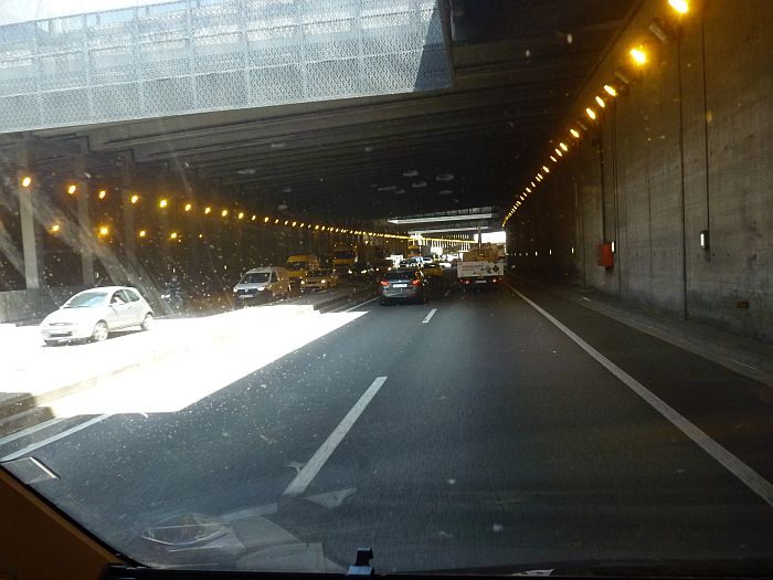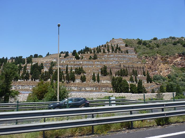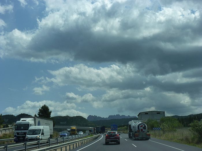 Campingplatz voll - ein spanisches Wochenende steht vor der Tür ...![]() ... mein Platz wird auch gleich frei - sicher bleibt er es nicht lange! Also ... ![]() ... wieder mal auf die Landstraße zurück ... ![]() ... immer mal einen Seitenblick - obwohl ... ![]() ... heute dort doch recht viel los ist! ![]() Na immer dem roten Streifen nach ... ![]() ... der führt mich bestimmt nach Barceelona - da hinten schon die Berge ... ![]() Die gute Nachricht - die Berge kommen näher - die schlechte - die Wolken werden dunkler! ![]() ... Links schon die Berge vom Kloster "Montserrat" ... ![]() ... bereits ein interessant angelegter Friedhof in Barcelona - aber ... ![]() ... das kenne ich doch - der Kreuzfahrtanleger - und über den Turm bin ich auch schon gegondelt!